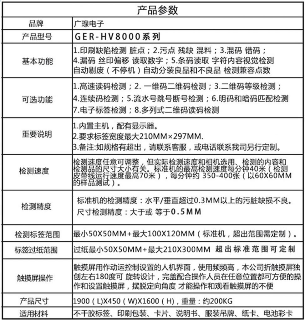 - 單張品檢機型號:GER-HV8002 項目簡(jiǎn)介: 廣瑔單張品檢機主要是通過(guò)自動(dòng)化平臺將每一張吊牌或紙卡傳送到視覺(jué)檢測系統下方進(jìn)行ccd采集,系統檢……